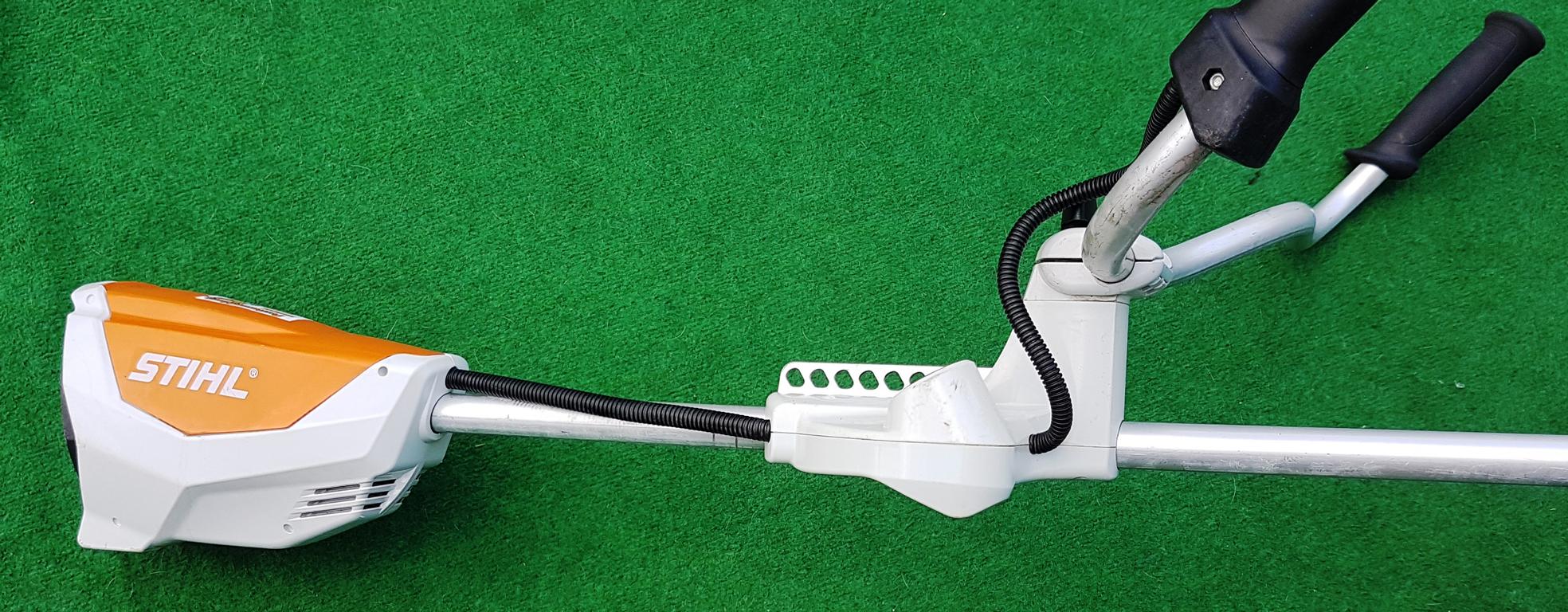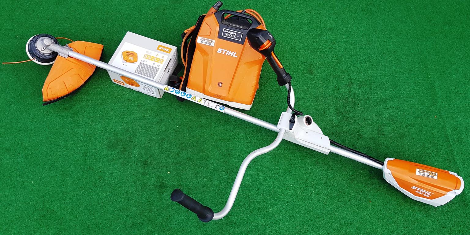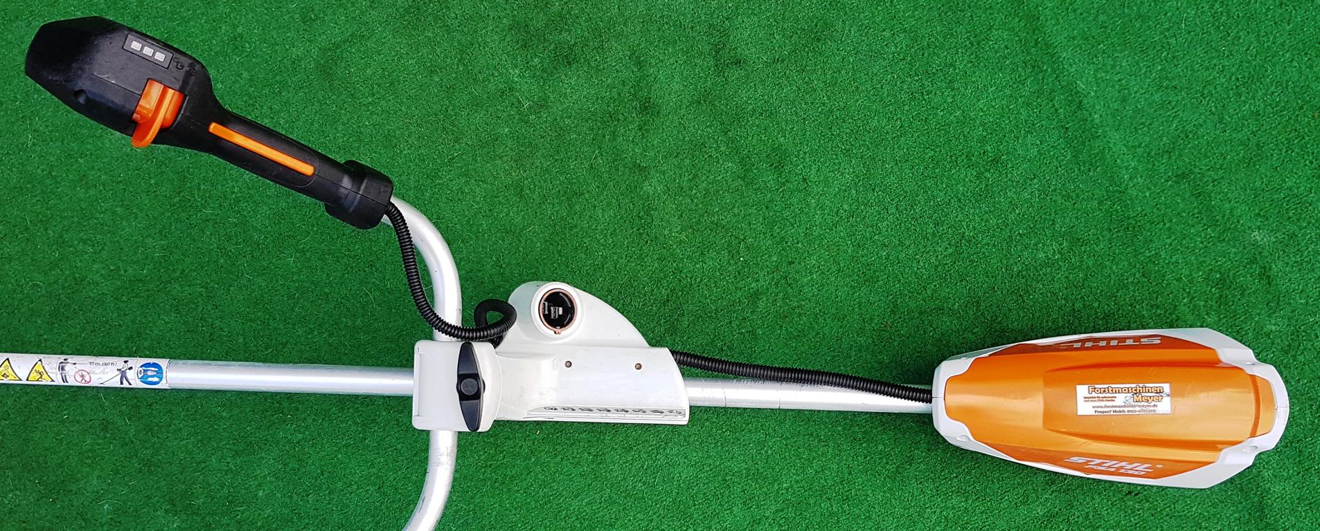 Leistungsstarke und leichte Akku-Motorsense für Flächenarbeiten in zähem Gras. Schneidkreis-Durchmesser 260 mm mit Grasschneideblatt, drei Leistungsstufen einstellbar. Einhängevorrichtung zum Tragen des Gerätes mit rückentragbarem Akku AR oder Tragsystem AP.