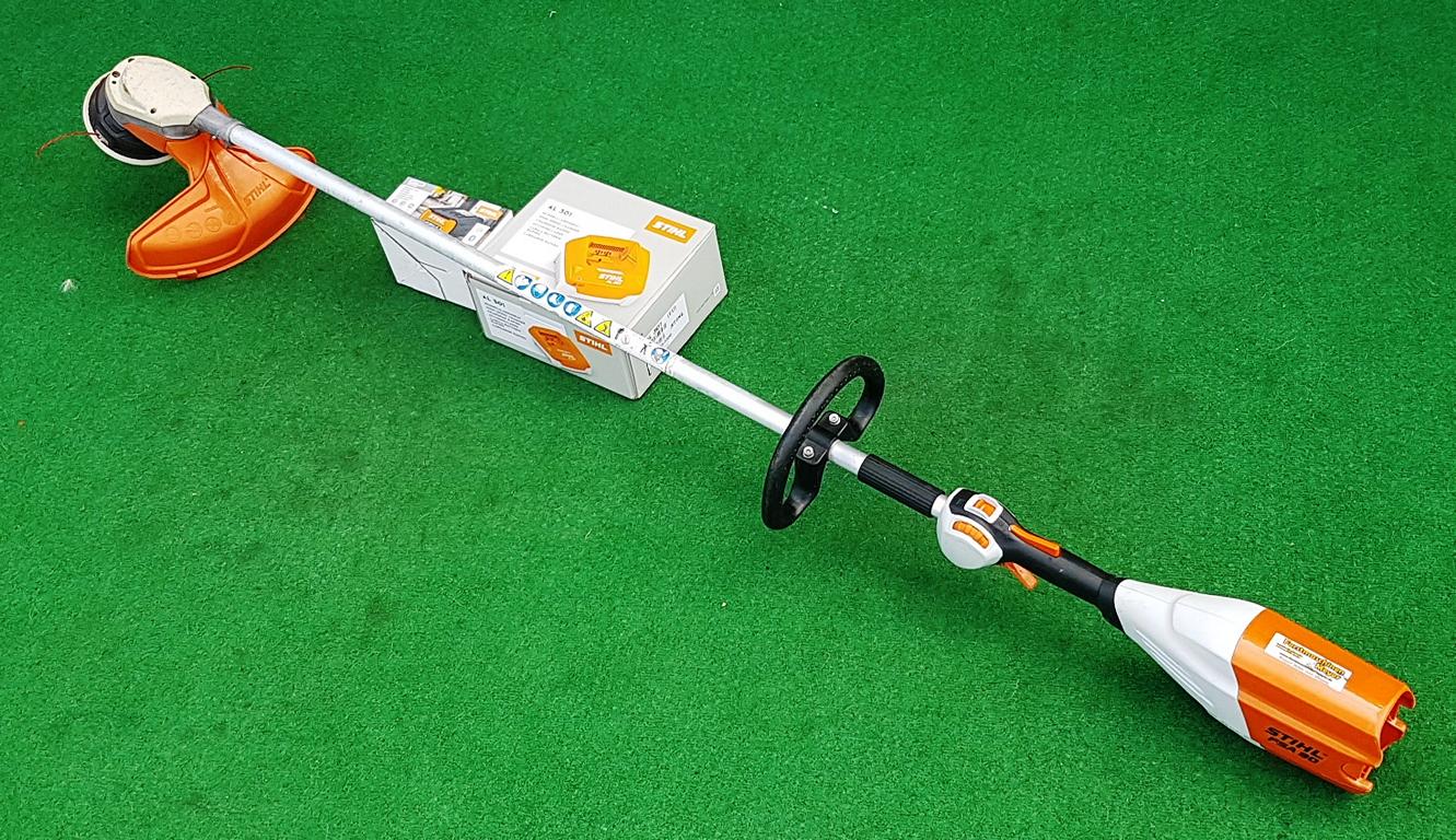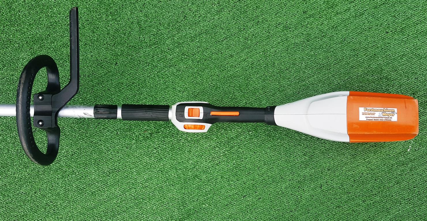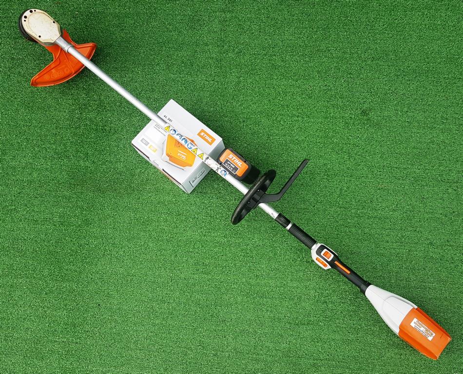 Akku-Motorsense für Flächenarbeiten in zähem Gras. Bediengriff mit Teillastfunktion ECOSPEED, kein Gehörschutz erforderlich.