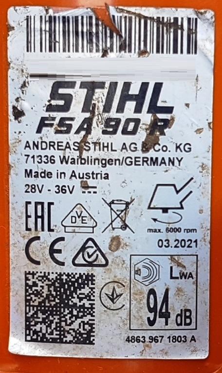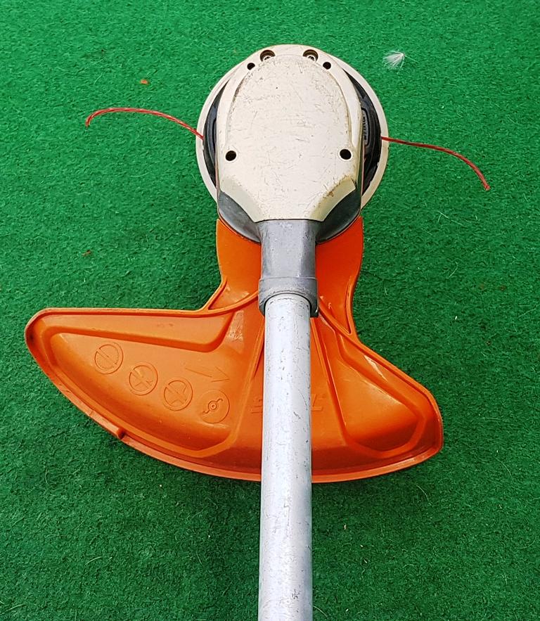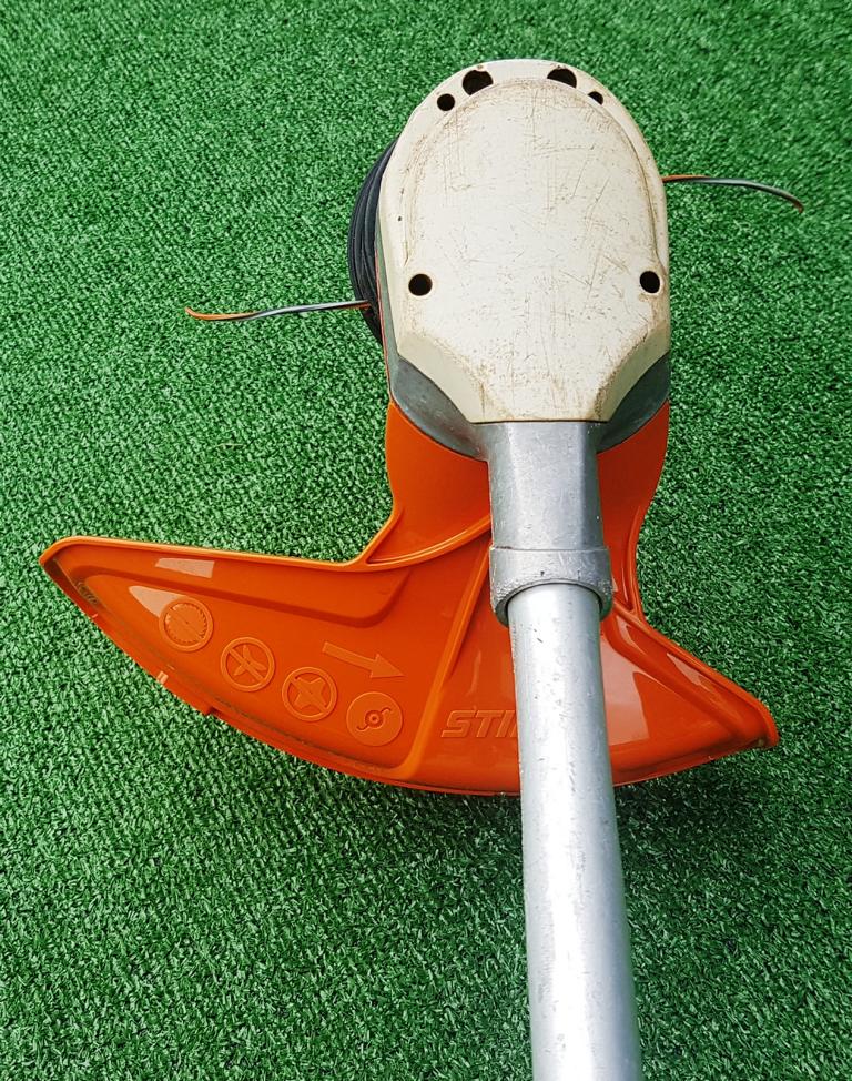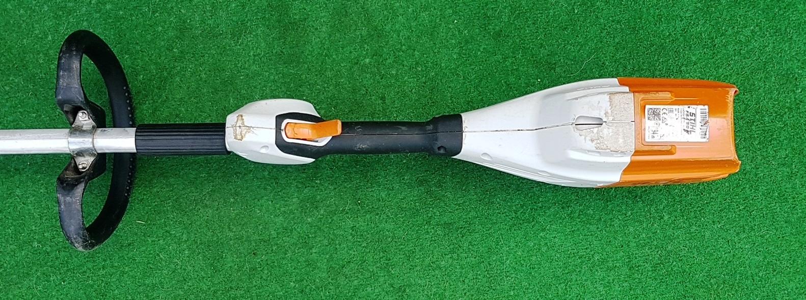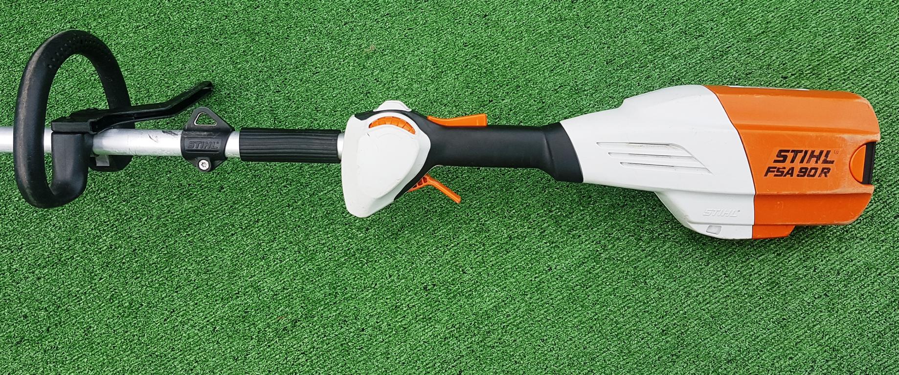 Akku-Motorsense für Flächenarbeiten in zähem Gras. Bediengriff mit Teillastfunktion ECOSPEED, kein Gehörschutz erforderlich.