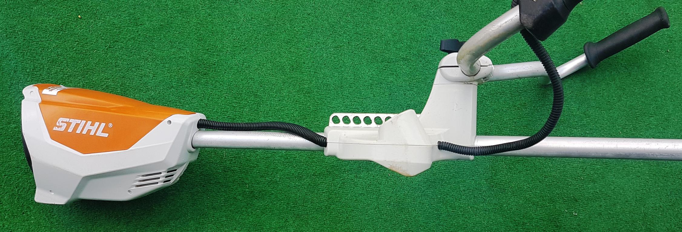Leistungsstarke und leichte Akku-Motorsense für Flächenarbeiten in zähem Gras. Schneidkreis-Durchmesser 260 mm mit Grasschneideblatt, drei Leistungsstufen einstellbar. Einhängevorrichtung zum Tragen des Gerätes mit rückentragbarem Akku AR oder Tragsystem AP.