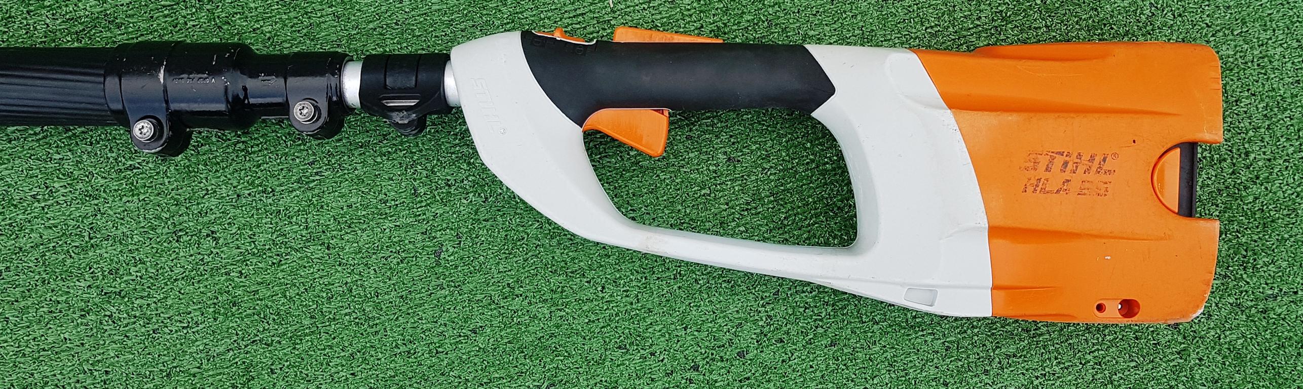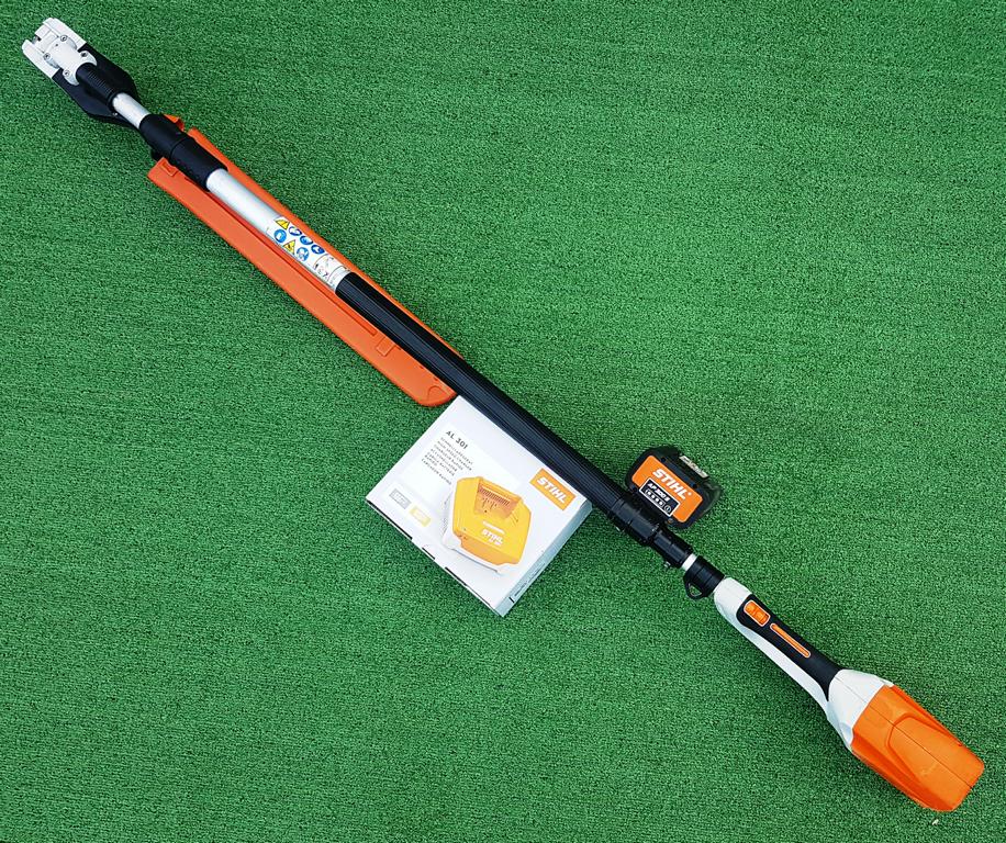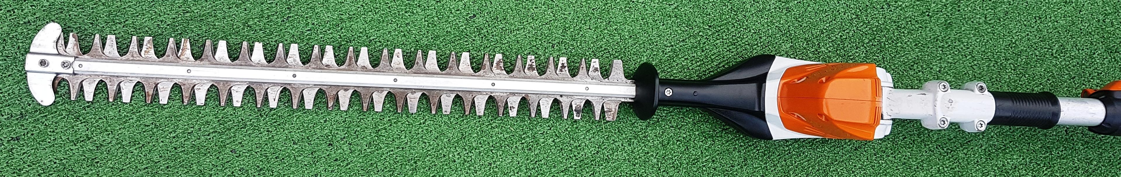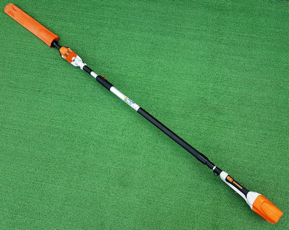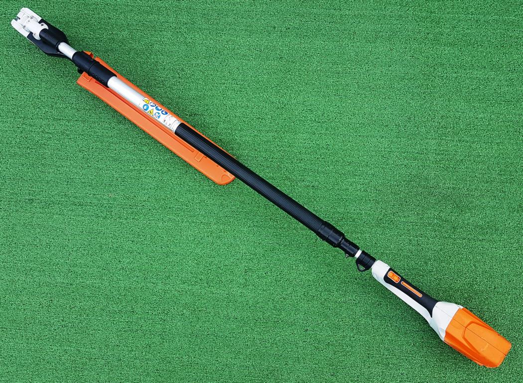 Akku-Heckenschneider für den professionellen Einsatz mit hoher Reichweite durch Teleskopschaft. Stufenlose Drehzahl, ideal einstellbar für Kopf-, Seiten- und Bodenschnitt, um 115° schwenkbarer Messerbalken, doppelseitig geschliffene Messer, werkzeuglose Schaftlängeneinstellung durch Schnellspannhebel, Transportlänge 180 cm, Gesamtlänge 260 bis 330 cm.