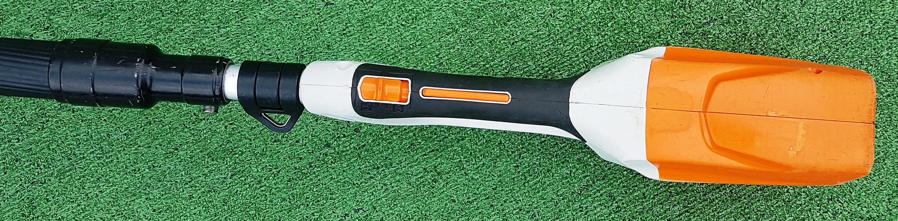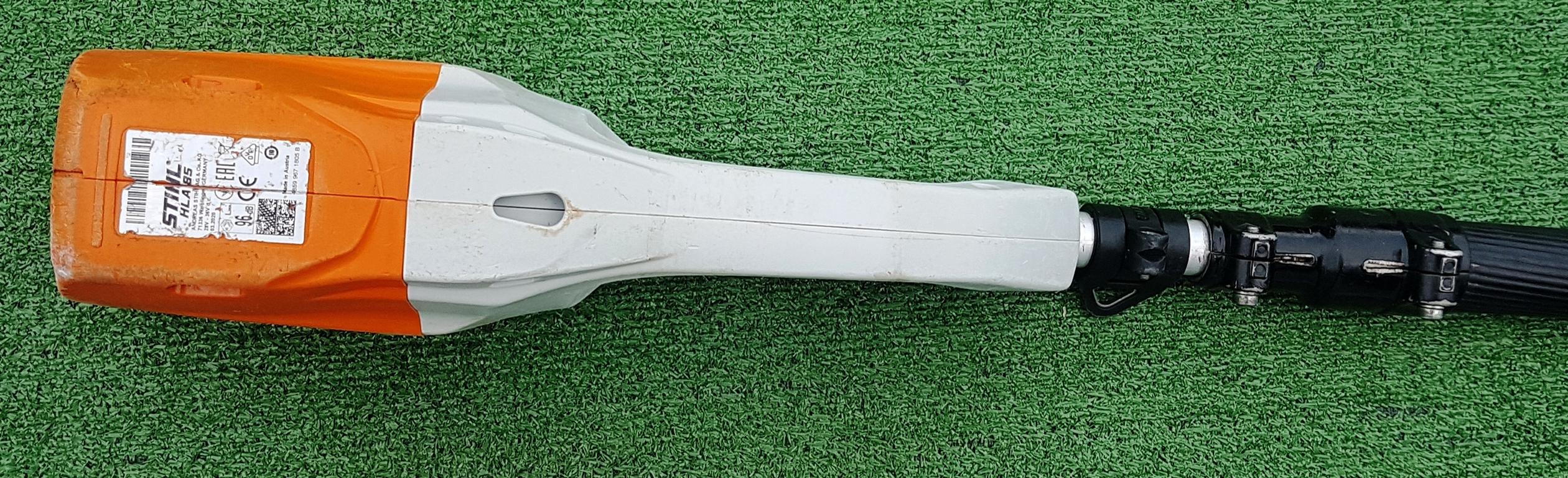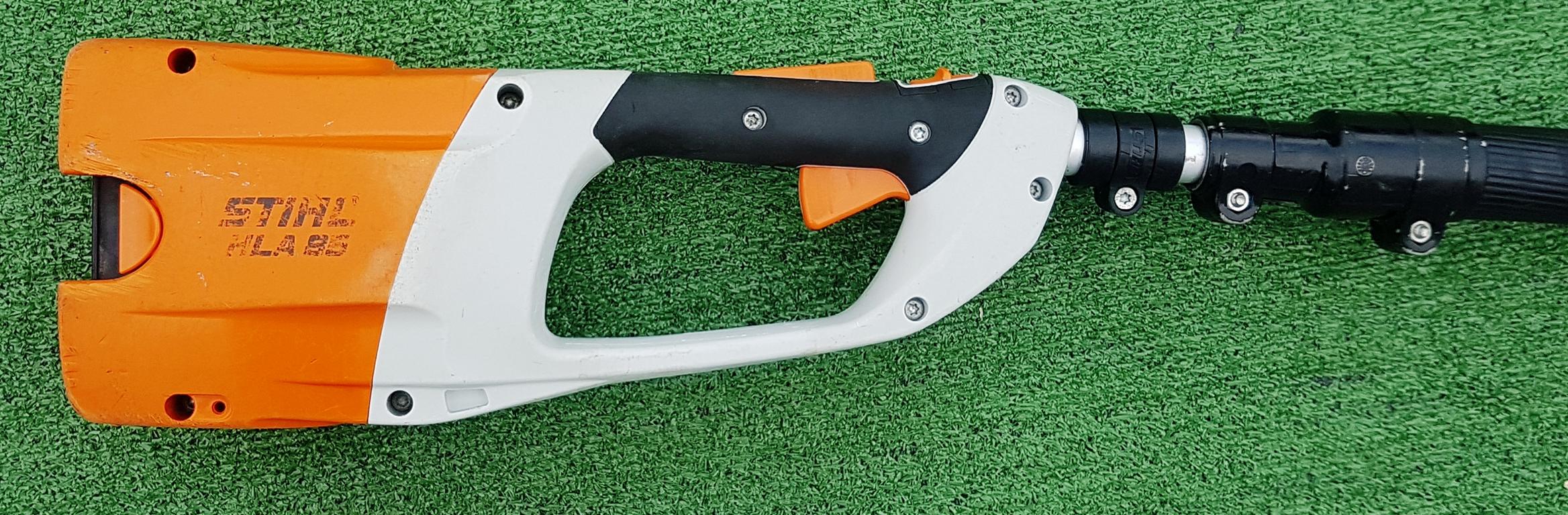 Akku-Heckenschneider für den professionellen Einsatz mit hoher Reichweite durch Teleskopschaft. Stufenlose Drehzahl, ideal einstellbar für Kopf-, Seiten- und Bodenschnitt, um 115° schwenkbarer Messerbalken, doppelseitig geschliffene Messer, werkzeuglose Schaftlängeneinstellung durch Schnellspannhebel, Transportlänge 180 cm, Gesamtlänge 260 bis 330 cm.