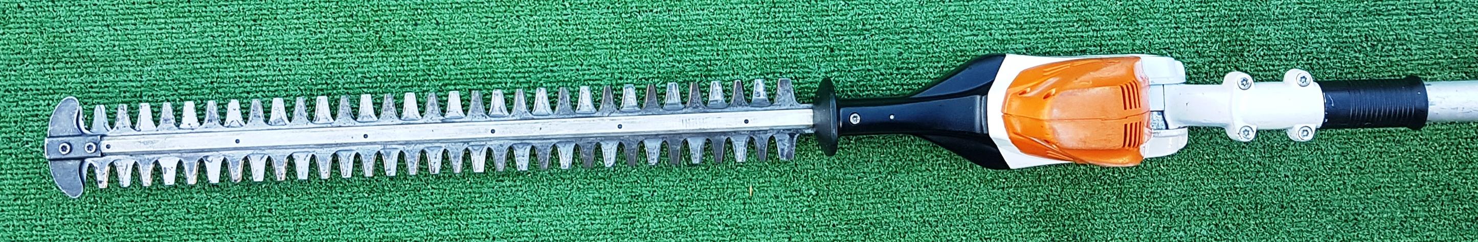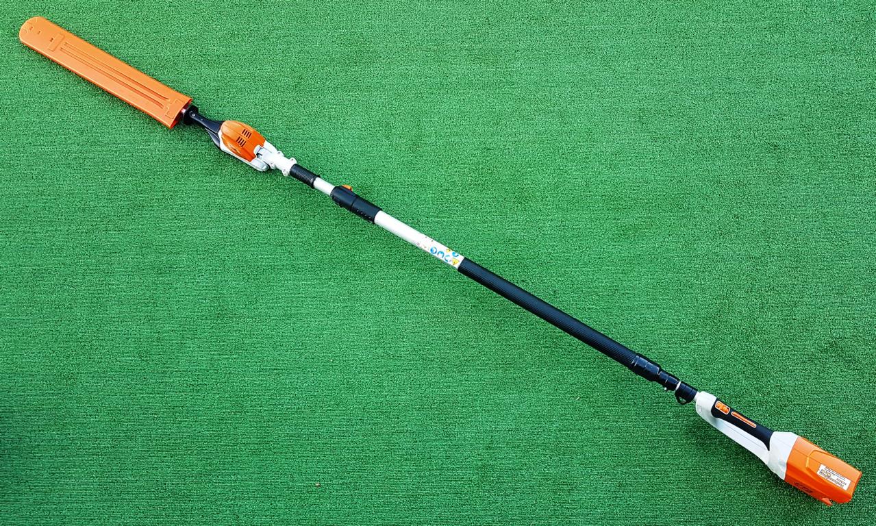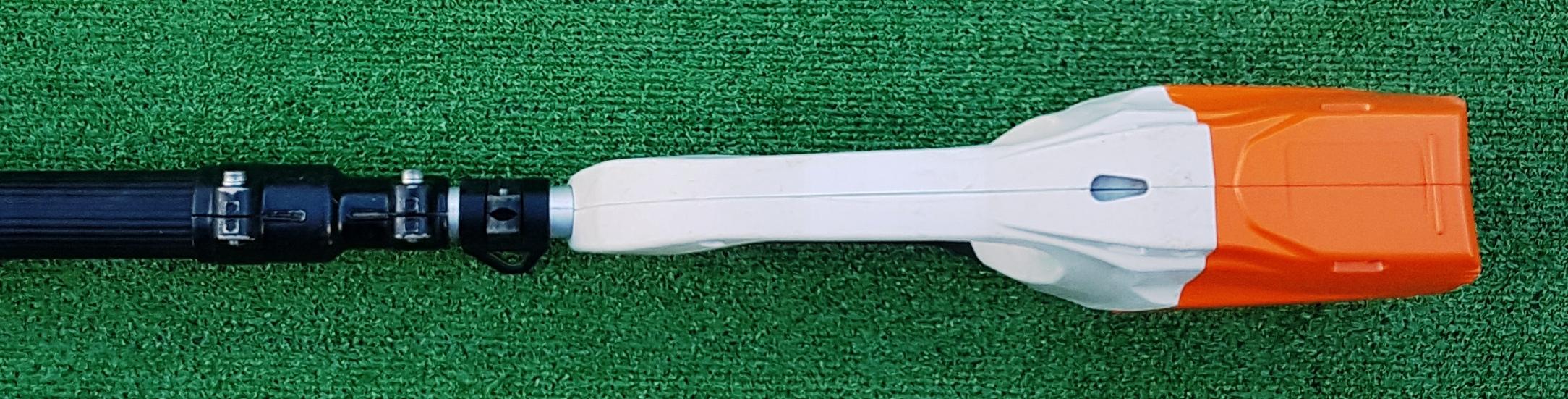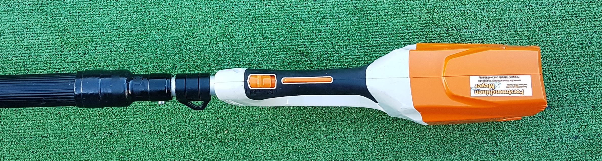 Akku-Heckenschneider für den professionellen Einsatz mit hoher Reichweite durch Teleskopschaft. Stufenlose Drehzahl, ideal einstellbar für Kopf-, Seiten- und Bodenschnitt, um 115° schwenkbarer Messerbalken, doppelseitig geschliffene Messer, werkzeuglose Schaftlängeneinstellung durch Schnellspannhebel, Transportlänge 180 cm, Gesamtlänge 260 bis 330 cm.
