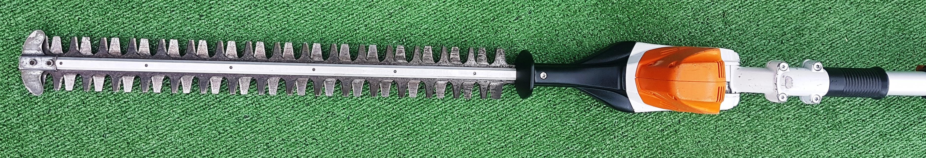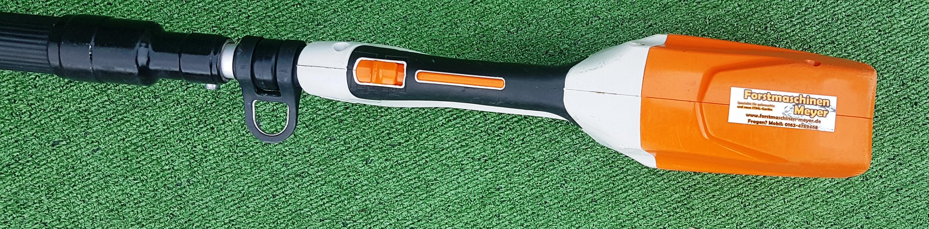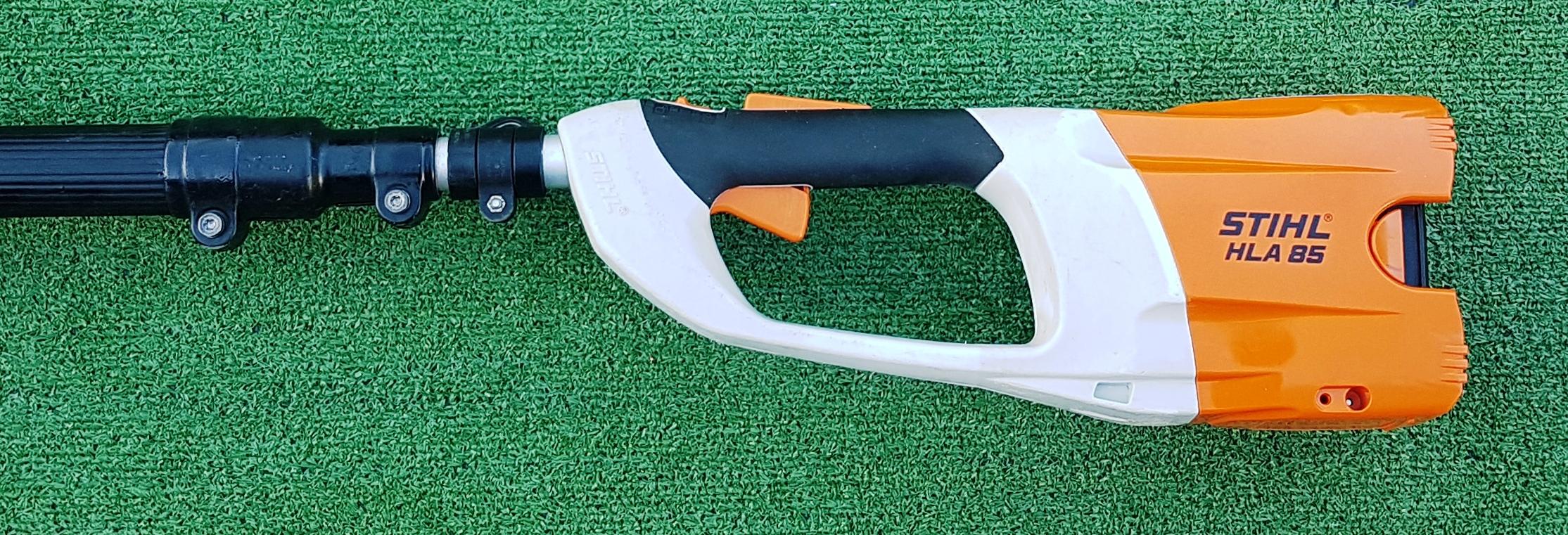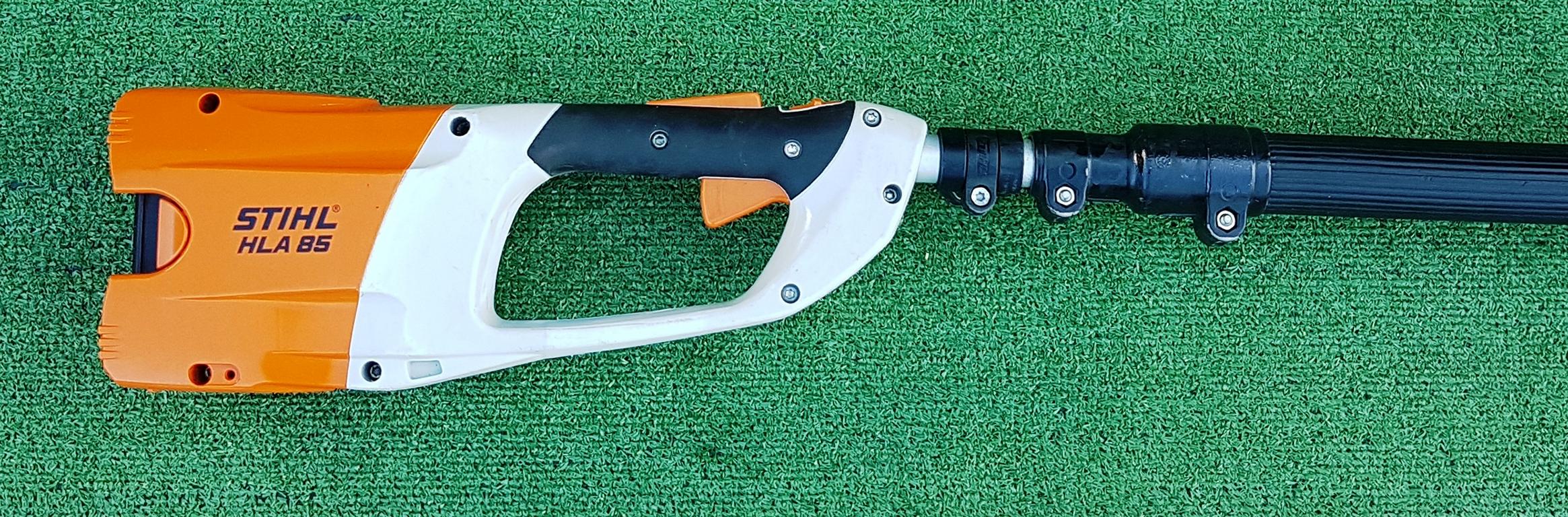 Akku-Heckenschneider für den professionellen Einsatz mit hoher Reichweite durch Teleskopschaft. Stufenlose Drehzahl, ideal einstellbar für Kopf-, Seiten- und Bodenschnitt, um 115° schwenkbarer Messerbalken, doppelseitig geschliffene Messer, werkzeuglose Schaftlängeneinstellung durch Schnellspannhebel, Transportlänge 180 cm, Gesamtlänge 260 bis 330 cm.