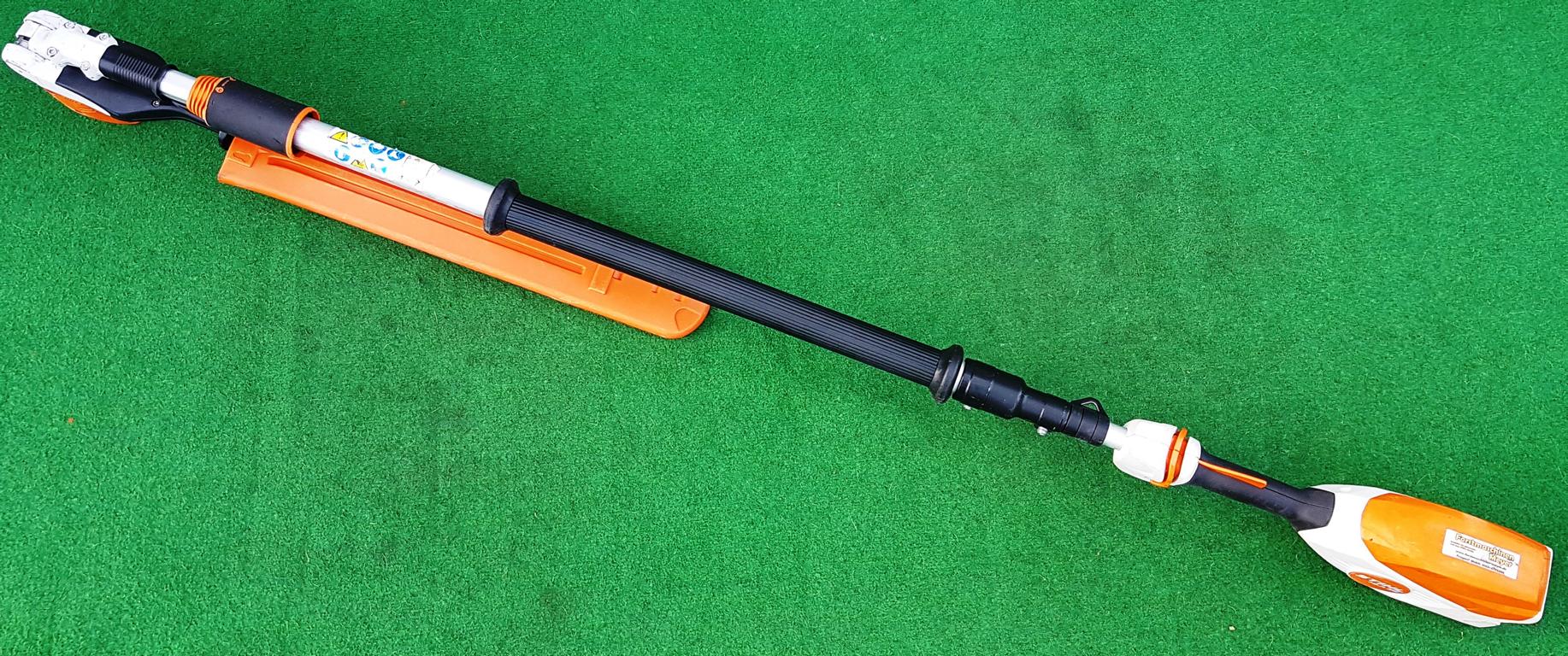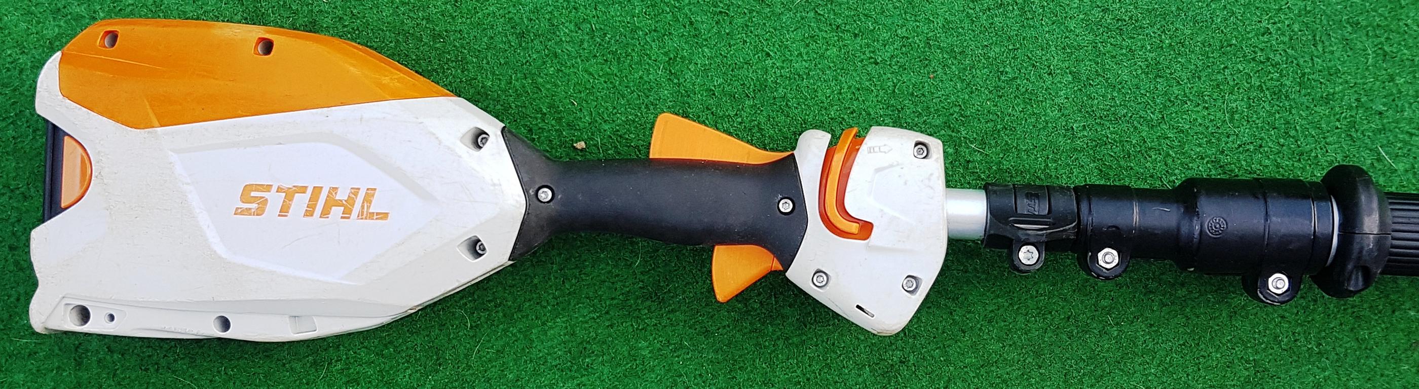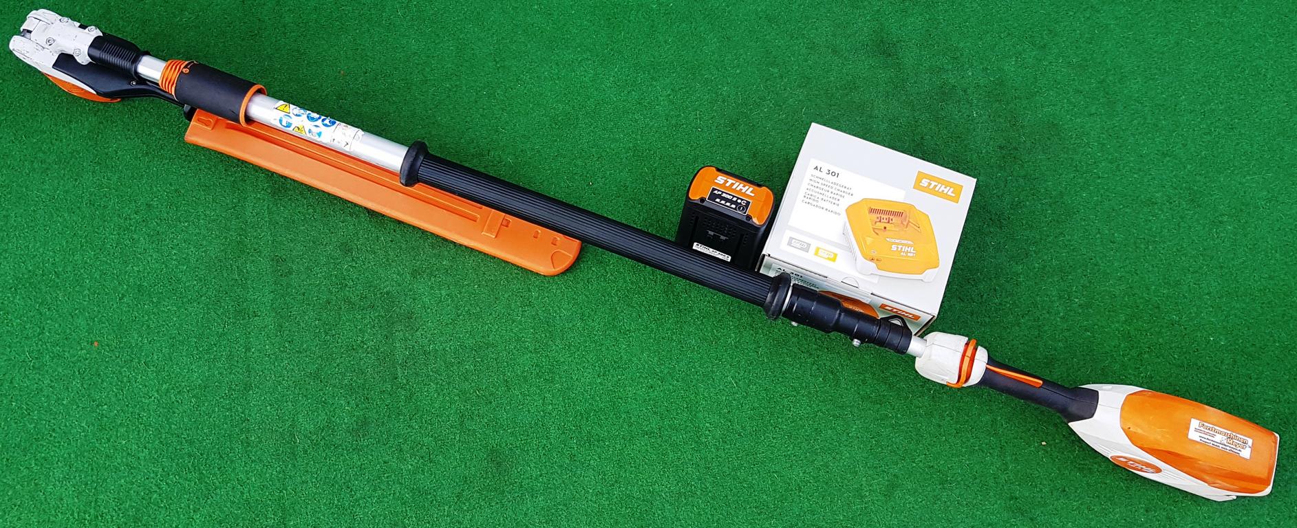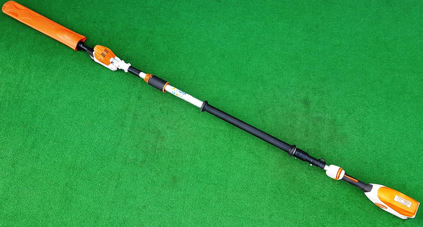 Akku-Heckenschneider für den professionellen Einsatz mit hoher Reichweite durch Teleskopschaft. Stufenlose Drehzahl, ideal einstellbar für Kopf-, Seiten- und Bodenschnitt, um 115° schwenkbarer Messerbalken, doppelseitig geschliffene Messer, werkzeuglose Schaftlängeneinstellung durch Schnellspannhebel, Transportlänge 180 cm, Gesamtlänge 260 bis 330 cm.