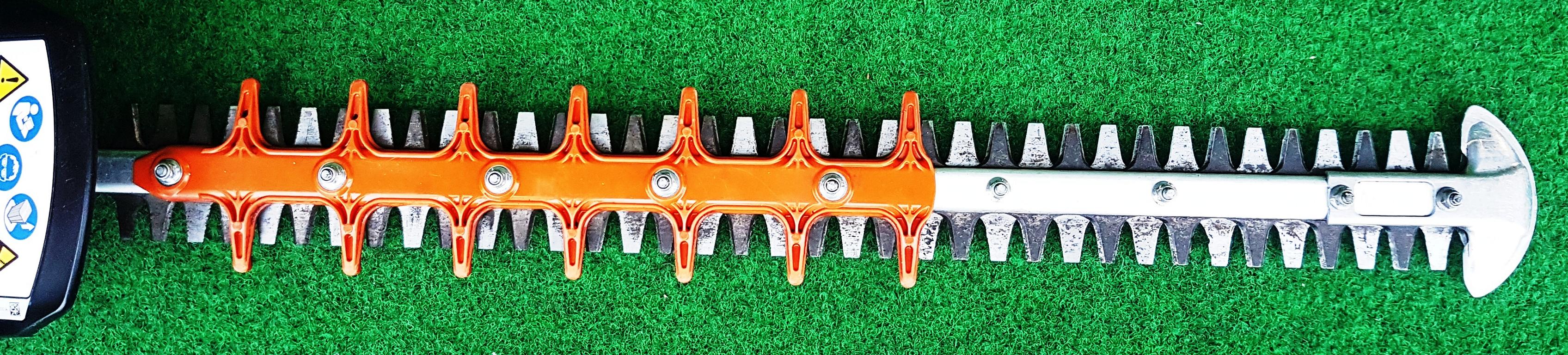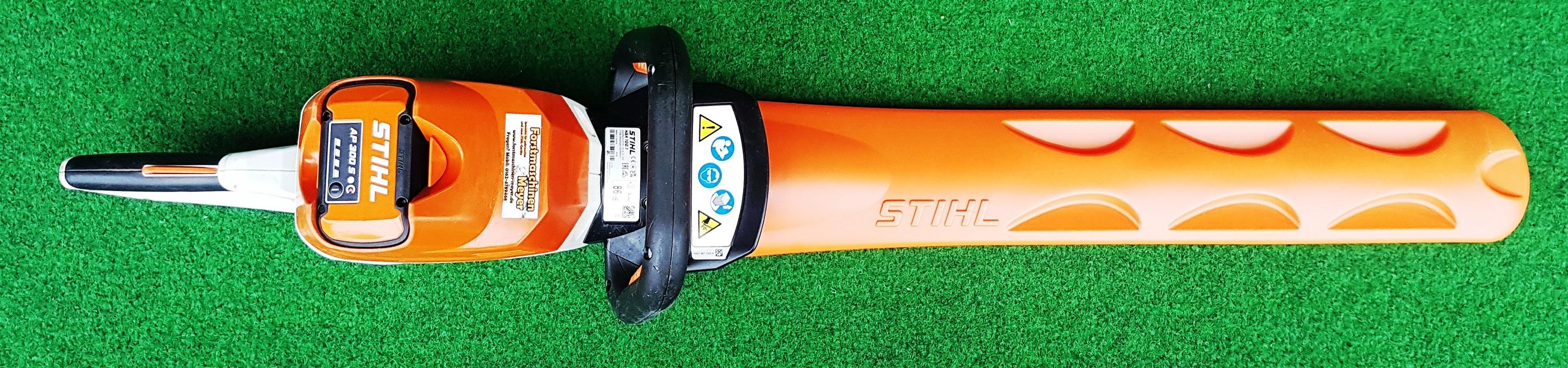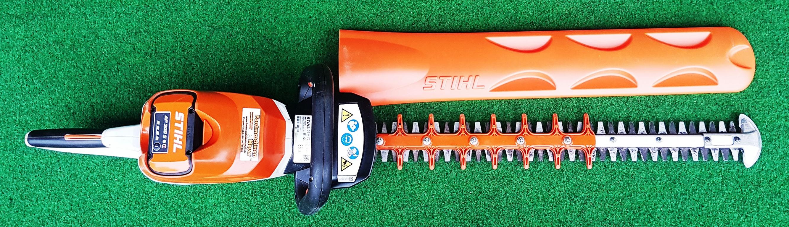 Ein aufgeschraubter Schnittschutz reduziert das Risiko des Kontakts mit den Schneidmessern und unterstützt so das sichere Arbeiten mit der HSA 100 von STIHL. Beim Schneiden in Bodennähe oder an Mauern wird die Schneidgarnitur durch den aufgeschraubten Führungsschutz gegen Verschleiß geschützt.
