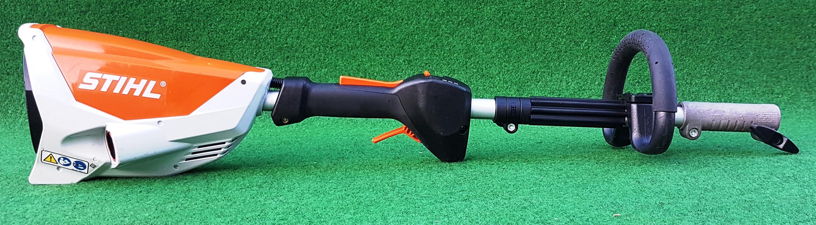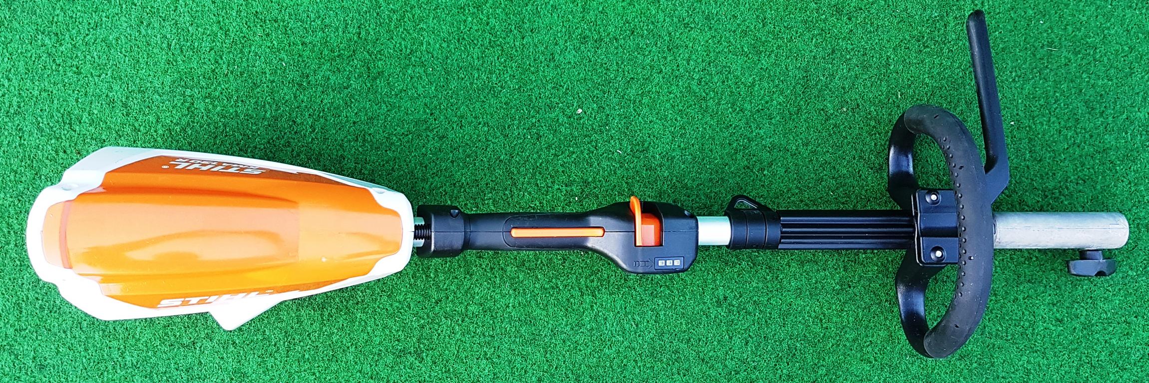 Leistungsstarker Akku-KombiMotor mit hohem Drehmoment bei geringem Gewicht. Drei Leistungsstufen für energieeffizientes und geräuscharmes Arbeiten bei allen Anwendungen, Traggurt, Gewicht 3,2 kg.
