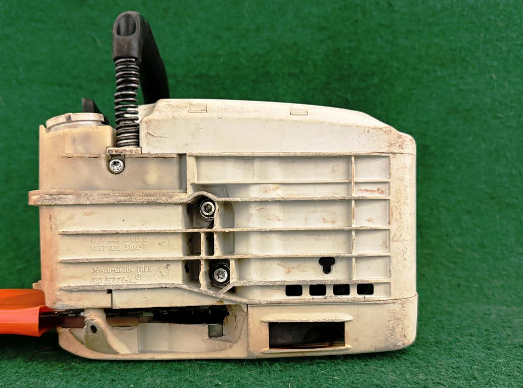 Die Spannschraube wird seitlich durch den Kettenraddeckel hindurch betätigt. Das verhindert den Kontakt der Hand mit der scharfen Sägekette und den Spitzen des Krallenanschlages.