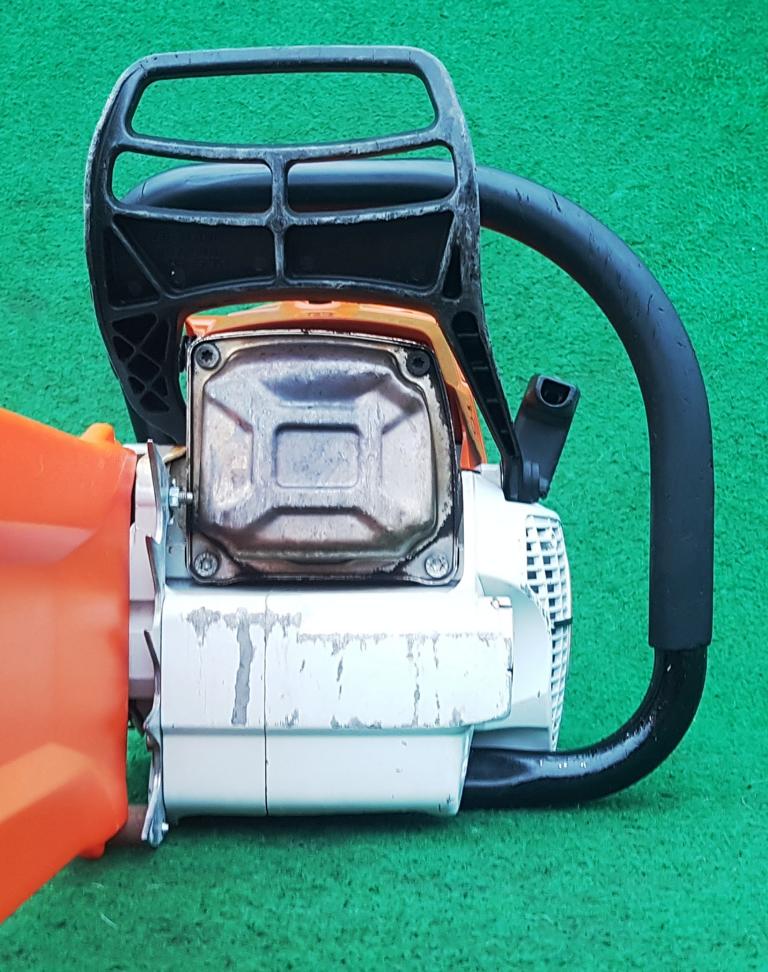 Die Spannschraube wird seitlich durch den Kettenraddeckel hindurch betätigt. Das verhindert den Kontakt der Hand mit der scharfen Sägekette und den Spitzen des Krallenanschlages.